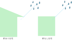図でもあるように軒があると、直接外壁に雨が降ってくることはなく軒部分で雨の方向が変化します。