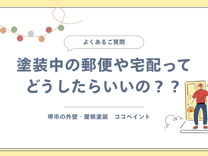 2026年2月5日 更新!塗装中の郵便や宅配ってどうしたらいいの?? 堺市の皆様、こんにちは! 堺市創業年数No.1、外壁塗装・屋根塗装専門店のココペイントです! ブログ担当は、これまで4500件の施工をさせて頂いている藤井です。 「工事中の郵便や宅配ってどうすればいいですか...MORE
