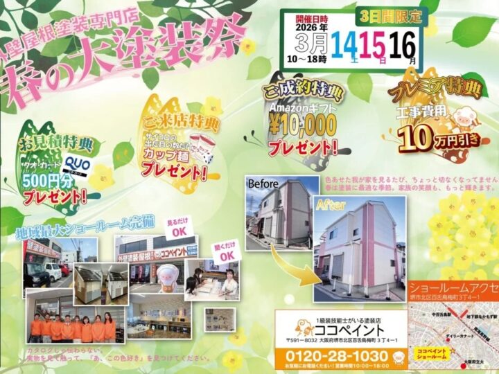 2026年3月4日 更新!【3/14~16】🌸3日間限定 今年も✨️春の大塗装祭2026決定🌸 堺市の皆様、こんにちは! 堺市創業年数No.1、外壁塗装・屋根塗装専門店のココペイントです! ブログ担当は、これまで4500件の施工をさせて頂いている藤井です。 今年もこの季節がやってきました♬ 春の大塗装祭...MORE